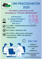 Powiatowy Urząd Pracy w Bochni informuje, że w ramach Dni Pracodawców 2025 organizuje cykl indywidualnych konsultacji pod nazwą „Poranek z Możliwościami”.