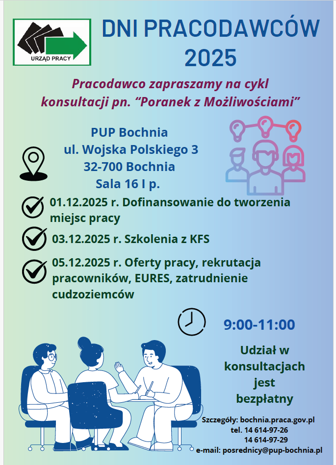Powiatowy Urząd Pracy w Bochni informuje, że w ramach Dni Pracodawców 2025 organizuje cykl indywidualnych konsultacji pod nazwą „Poranek z Możliwościami”.