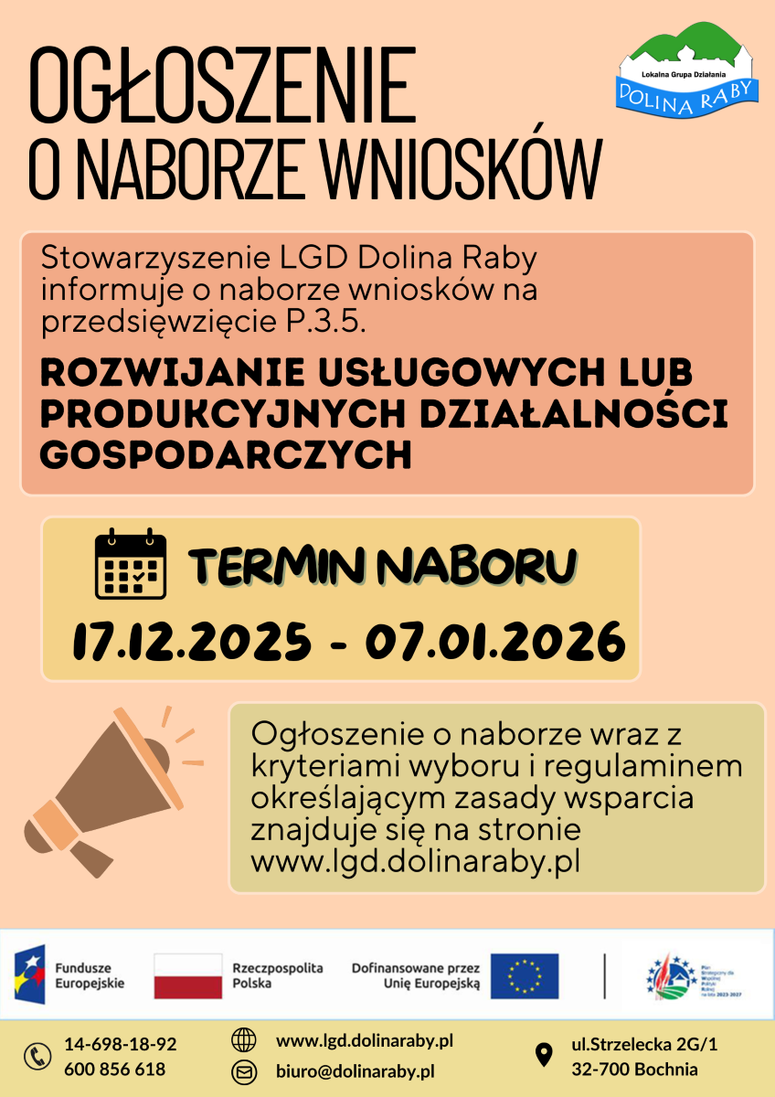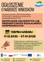 Stowarzyszenie Lokalna Grupa Działania „Dolina Raby” informuje o realizacji Lokalnej Strategii Rozwoju (LSR) poprzez ogłoszenie naboru wniosków o przyznanie pomocy w ramach przedsięwzięcia P.3.5 Rozwijanie usługowych lub produkcyjnych działalności gospodarczych.