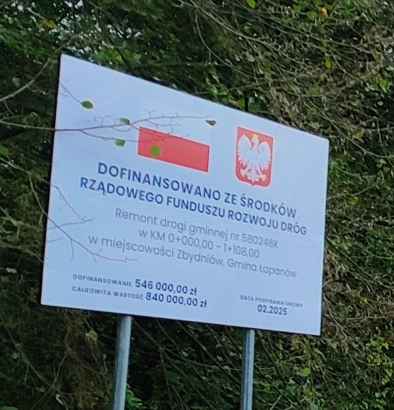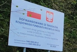 Gmina Łapanów pozyskała wsparcie finansowe dla przedmiotowej inwestycji z Małopolskiego Urzędu Wojewódzkiego w Krakowie. Wartość dofinansowania z Rządowego Funduszu Rozwoju Dróg dla Gminy Łapanów wyniosła 546.000,00 zł, co stanowi 65% wartości inwestycji, a wkład własny Gminy w wysokości 35% – 294.000,00 zł.