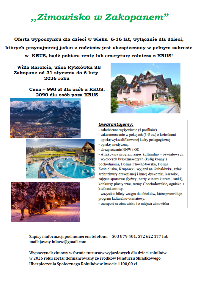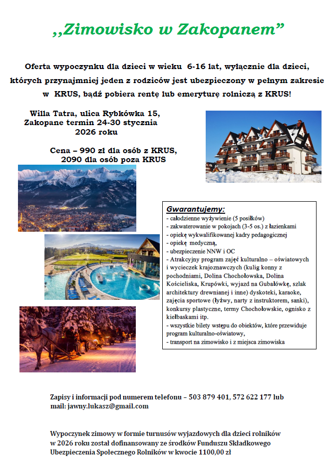 Oferta wypoczynku w formie kolonii i zimowiska dla dzieci i młodzieży rolników, dofinansowana z Funduszu Składkowego Ubezpieczenia Społecznego Rolników, potocznie z KRUS