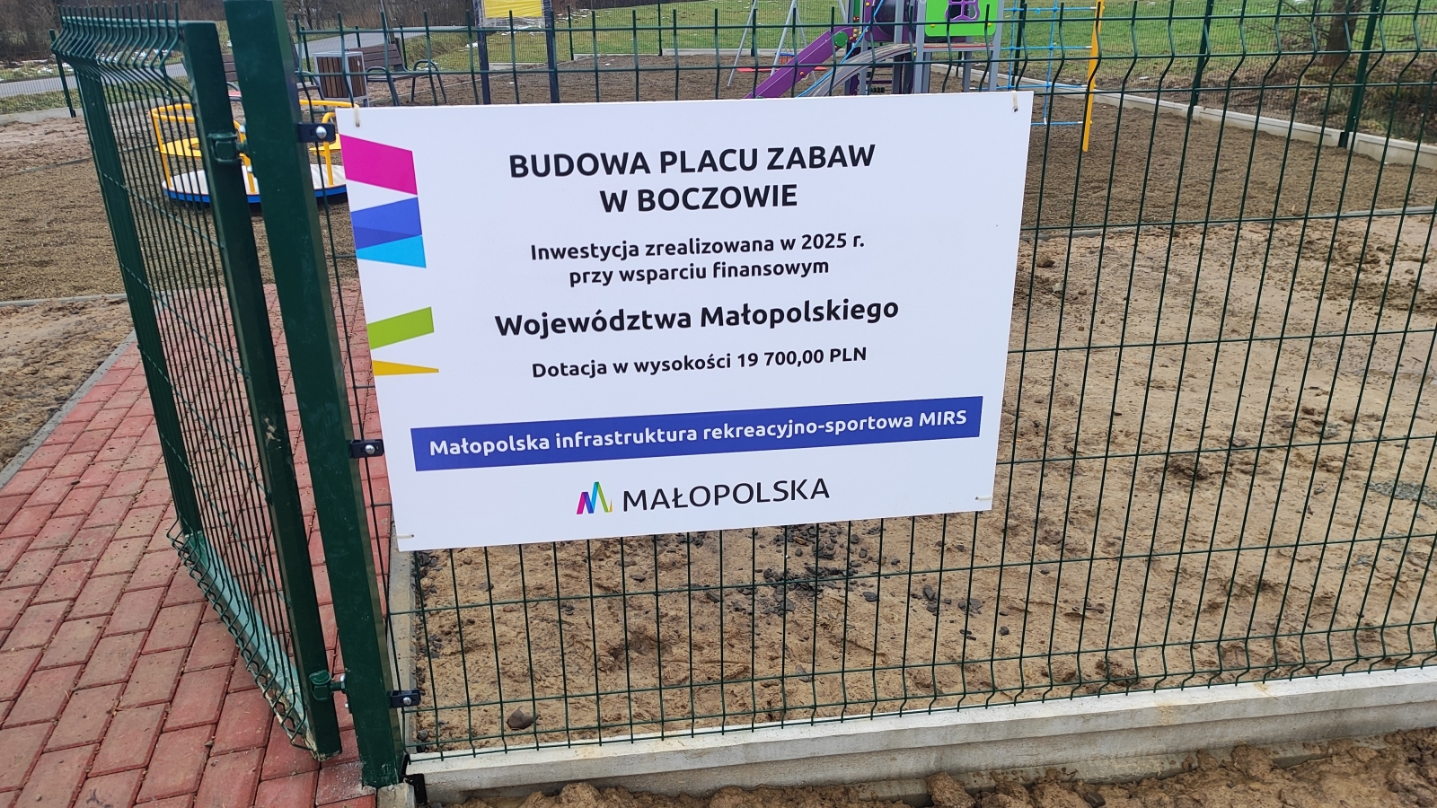 Nowy plac zabaw powstał na działkach nr 80/6 i 80/7 w Boczowie. W jego skład wchodzą: zestaw zabawowy ze ścianką wspinaczkową i zjeżdżalniami, podwójna huśtawka z siedziskiem płaskim i kubełkowym, karuzela, trampolina, ławki, kosz na śmieci oraz tablica z regulaminem. Całość została ogrodzona estetycznym ogrodzeniem panelowym z furtką, a pod urządzeniami wykonano bezpieczną nawierzchnię z kruszywa. Prace budowlane zrealizowała firma SEB-TRANS z Kobylca.