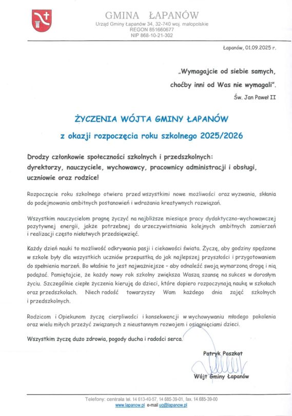 / Życzenia Wójta Gminy Łapanów na rozpoczęcie roku szkolnego 2025/2026 Aktualności Życzenia Wójta Gminy Łapanów na rozpoczęcie roku szkolnego 2025/2026 01.09.2025 - Grzegorz Statek Zapisz do PDF Powrót Pomoc UkrainieBiuletyn Informacji PublicznejWażne informacjeElektroniczna Skrzynka PodawczaElektroniczny Dziennik UrzędowyMonitor PolskiDziennik UstawRodzina 500 plusOgólnopolska karta Dużej RodzinyCentralna Ewidencja i Informacja o Działalności GospodarczejWojskowe Centrum Rekrutacji w TarnowieObywatel.Gov.plBadania ankietowe w Małopolsce